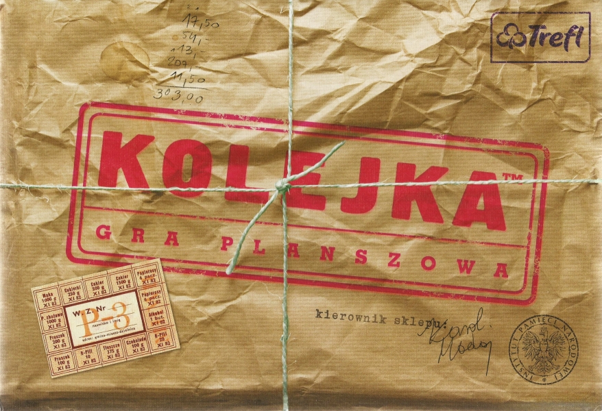 Kolejka / Karol Madaj ; ilustracje Natalia Baranowska, Marta Malesińska ; opracowanie merytoryczne dr Andrzej Zawistowski. - Gdańsk : Trefl ; 2014. - 1 gra (2 plansze, 30 pionków w 6 kolorach, 1 znacznik gracza rozpoczynającego, 1 znacznik przekupki, 50 kart kolejki (duże karty po 10 w pięciu kolorach), 5 kart listy zakupów, 60 kart towarów (małe karty po 12 w pięciu kolorach), 15 kart dostawy towarów, 5 kart pomocy gracza) : papier, karton drewno, kolor ; w pudełku 25x36x6 cm. + instrukcja (39 [1] strona : ilustracje ; 20 cm).