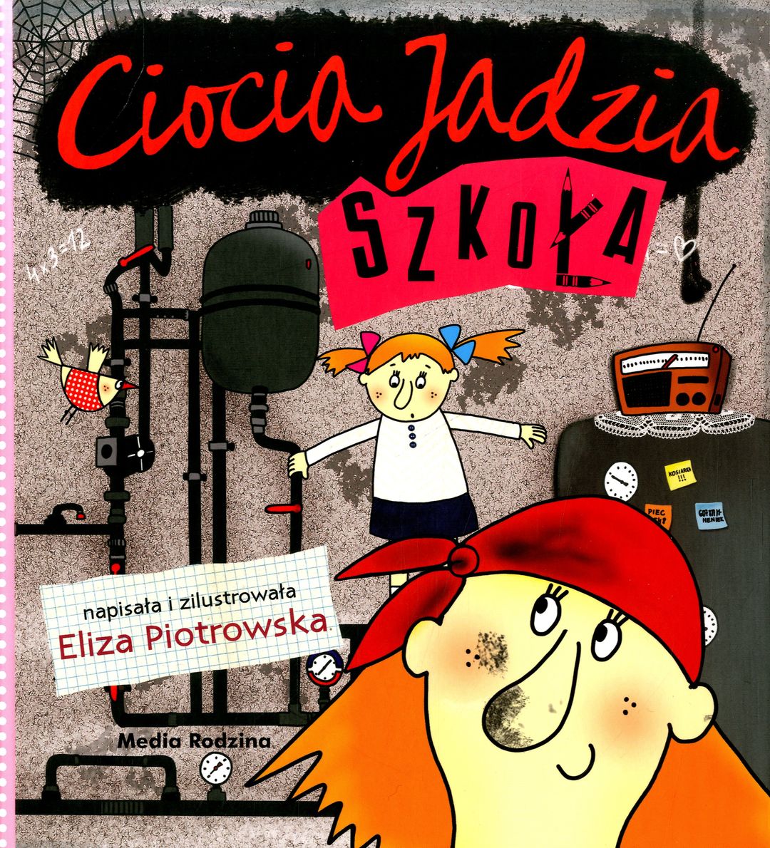 Ciocia Jadzia ma nową pracę. Została woźną w szkole! Dobrze się składa, bo jej bratanica właśnie zaczyna naukę w pierwszej klasie i obecność cioci Jadzi dodaje jej odwagi. Ciocia Jadzia zajmuje się też kotłownią i często przebywa w piwnicy. A tam są rury, w nich pogłos i czasem można poznać szkolne tajemnice, więc ciocia Jadzia jest świetnie zorientowana i czasem może wpływać na bieg wydarzeń... a wtedy wszystko zmienia się na lepsze. Trzecia już książka z ciocią Jadzią w roli głównej skierowana jest do dzieci, które właśnie nauczyły się czytać i same mogą się zapoznać z tymi zabawnymi historyjkami.